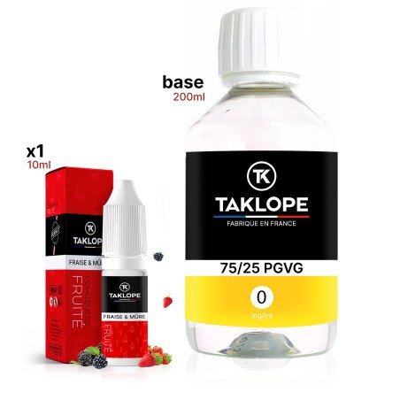 Note : en version 0mg, le Pack DIY Fraise & Mûre 210ml contient seulement une bouteille de base DIY Taklope 200ml remplie ainsi qu'un arôme 10ml Fraise & Mûre Taklope à diluer.